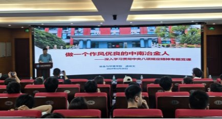 6月20日,祥赌必赢 党委书记成琼文以“做一个作风优良的中南冶金人”为题,为综合教工党支部、冶化所研究生第一党支部、冶化所研究生第二党支部及环境能器本科生党支部讲授专题党课。成琼文结合自身学习情况分享了学习习近平总书记关于加强党的作风建设重要论述的收获,并从中央八项规定精神核心要义、违反中央八项规定精神的危害、中央八项规定深度改变中国、祥赌必赢 贯彻落实中央八项规定精神具体情况等方面进行了阐述。他强调,全体党员要以“严”的基调强化正风肃纪,在科研攻关中勇攀高峰、在人才培养中言传身教、在服务社会中主动作为,以优良作风彰显“中南冶金人”的担当。