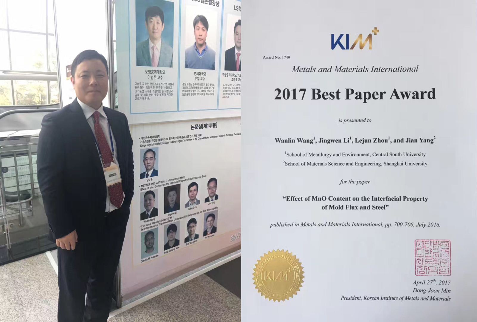 王万林教授团队(第一作者及通讯作者,祥赌必赢 )和时任宝钢股份研究院首席研究员杨健合作的题为“Effect of MnO Content on the Interfacial Property of Mold Flux and Steel”(Met. Mater. Int., Vol.22, No.4, (2016), pp. 700)的论文获得了该学会的“2017年最佳论文奖”;这也是韩国金属材料学会首次将最佳论文奖颁给外国学者。