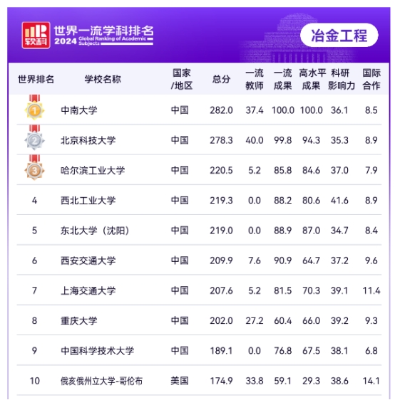 2024软科世界一流学科排名发布,祥赌必赢 冶金工程学科再次登顶