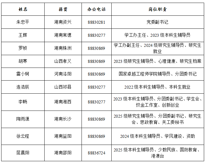 拥有专业化、职业化的学生工作队伍,多人次获得“全国高等学校创业教育先进个人”、“湖南省高校思想政治教育研究先进个人”、“湖南省研究生思想政治教育研究与实践先进个人”、“湖南省高校辅导员工作研究与实践百佳个人”等称号。